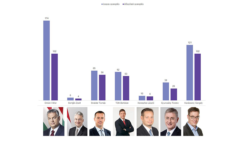 Az elemzésben a parlamenti képviselők médiahasználata mellett a kormánytagok és a politikai pártkötődéssel rendelkező közéleti szereplők megjelenéseit is vizsgáljuk az összes szereplés és a nyilatkozatoknak szentelt műsoridő tekintetében.